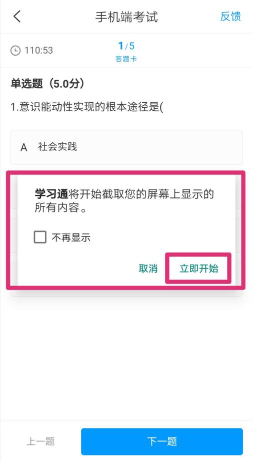 也可在钱能钱包-考试-考试列表端进入考试。进入考试之后会提示“学习通将开始截取您的屏幕上显示的所有内容”,考生需点击“立即开始”。