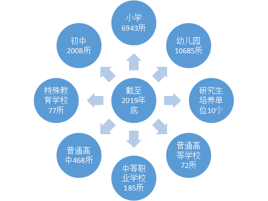 截至2019年底,全省共有幼儿园10685所,在园幼儿154.52万人,专任教师9.07万人;小学6943所,在校生388.30万人,专任教师21.25万人;初中2008所,在校生179.28万人,专任教师12.82万人;特殊教育学校77所,在校残疾学生3.89万人(其中随班就读2.57万人),专任教师1911人;普通高中468所,在校生99.21万人,专任教师6.81万人;中等职业学校185所,在校生43.81万人,专任教师1.75万人;普通高等学校72所(其中,本科院校29所,专科院校43所),普通本专科在校生76.57万人(其中,本科37.11万人,专科39.46万人),专任教师3.78万人;研究生培养单位10个,在校生2.37万人(其中,博士生1146人,硕士生2.25万人)。