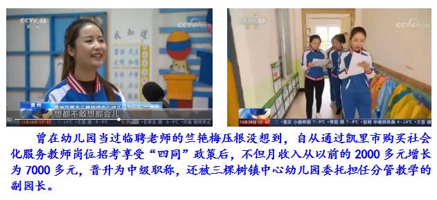 “贵州凯里明确提出非在编与在编教师待遇实行‘四同’”,这是陈宝生部长在第十三届全国人民代表大会常务委员会第十二次会议上作的《国务院关于学前教育事业改革和发展情况的报告》中的内容。