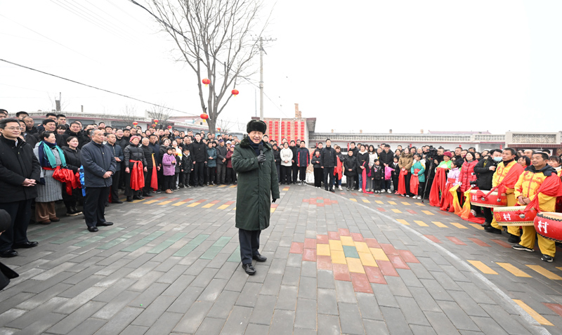 1月26日至27日,中共中央总书记、国家主席、中央军委主席习近平来到山西,看望慰问基层干部群众。这是26日下午,习近平在临汾市汾西县僧念镇段村文化广场,给乡亲们拜年,向全国各族人民、向港澳台同胞和海外侨胞致以美好的新春祝福。新华社记者 李学仁 摄